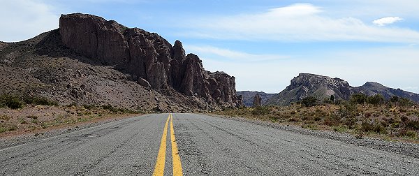 Hinter Las Plumas wird die Landschaft wieder flach, man verläßt das Flusstal und weit im Hintergrund verschindet die malerische Felslandschaft. Am Wegrand nur noch Zäune und ab und zu ein paar Schafe, Pferde oder Guanakos. Wir sahen ein Mara in einer falchen Lehmpfanne und Raubvögel. Nach 100 Kilometern endlich ein Hügel, von dem aus man die zurückgelegte Strecke überblicken kann.