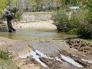 Von der anderen Seite kamen gerade zwei mit Schlamm bespritze Männer in einem offenen Gelände-Buggy mit Überroll-Bügel an, die diese Stelle nur mit Mühe pasiert hatten. Sie lachten, zeigen mit den Händen, wie hoch das Wasser sei und rieten uns von einer Durchquerung mit unserem Duster ab. Angesichts der triefenden Gestalten war das ziemlich überzeugend, wir wollten so fern von allem sowieso nichts riskieren und fuhren die Zufahrt wieder zurück.