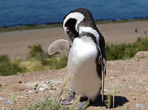 Jedes Jahr kommen zahlreiche Magellan-Pinguine an die Mündung der Lagune Caleta Valdés, die ersten bereits im September. Meistens sind es die Männchen, welche ihre alte Bruthöhle aus dem Vorjahr wieder herrichten. Wenig später folgen dann auch die Weibchen. Im Oktober konnten wir hier noch die Herren der Schöpfung beim Nestbau beobachten, sie schleppten Gras vom Strand die Steilküste hinauf in die Erdhöhlen, welche zum Teil direkt am Aussichtspunkt angelegt wurden. Andere wiederum brachten gebrauchtes Stroh aus den Höhlen hinunter zum Strand und warfen es ins Meer - Frühjahrsputz bei Pinguins.