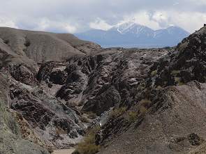 Hätte es keine kleine Ausschilderung an der Ruta Provinzial 12 gegeben, wir wären einfach daran vorbei gefahren. Von Calingasta kommend, liegt der Cerro El Alcazar ca. 15 Kilometer vor Barreal, dem nächsten größeren Ort. Eine staubige Abzweigung mit einem kleinen Schild, mehr sieht man zuerst nicht. Durch einen schmalen Engpass fährt man mit dem Auto nur gut 500 Meter eine kurvige Schlucht in die Felsenlandschaft hinein. Schon nach kurzer Fahrt erreicht man einen Platz, wo man den Wagen stehen lassen muß und ist umgeben von bunten, atemberaubenden Felsen, die man von der Straße aus gar nicht sieht.
