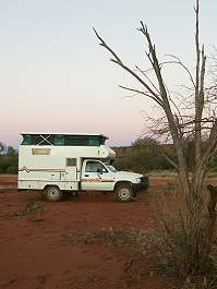 Der Sonnenuntergang war schön und eine schmale Mondsichel sorgte für eine dunkle NAcht. Nach dem ausgiebigen Essen genossen wir die Ruhe, den Wein und den Sterenenhimmel und gingen wie immer früh schlafen. Um Mitternacht kam ein Fahrzeug lautstark näher und das weckte uns aus dem Tiefschlaf. Seltsamerweise war der Wagen beim Erreichen der richtigen Lautstärke nicht querab, ganz im Gegenteil wurde es immer lauter und auch heller. Dann fing die Erde an zu beben! Ein Roadtrain mit einer Batterie Fernscheinwerfer raste auf der Wellblechpiste mit hoher Geschwindigkeit an unserem Camper vorbei und war dabei beleuchtet wie der weihnachtliche Coca Cola Truck. Bei völliger Dunkelheit hatten wir solchen Verkehr nicht erwartet. Nur gut, daß wir etwa 15 m zwischen uns und die Straße gelegt hatten, so blieb uns der meiste Staub erspart. Der Truck blieb aber bis zum nächsten Mittag das einzige Fahrzeug, dem wir auf dieser Straße begegnen sollten.