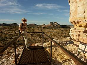 Doch wenn man denkt es könnte nicht mehr schlimmer kommen, dann kommt es schlimmer. Die Straße macht einen Knick von Südwest nach Süd, denn es ist noch eine Bergkette zu überqueren - die Charlotte Range. Der Weg hinauf weist tiefe Rinnen und Felsplatten auf, zusätzlich eine Steigung von geschätzten 22% - ausgemessen an einem passenden Foto. Unser Camper wackelte und schnaufte bedenklich. Endlich oben angekommen konnte man in weiter Ferne aber schon die Felsformationen des Chambers Pillar erkennen. Dann ging es nach hundert Metern quer auf dem Bergkamm wieder nach rechts hinunter - ebenfalls sehr steil. Ich wollte die Abfahrt filmen und stieg aus. Schon nach einigen Schritten setzte ich mich auf den Hosenboden und verletzte mich am Fuss, weil ich mich auf dem glatten und staubigen Fels nicht halten konnte.