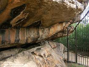 Die Gitter vor den Felsen sind hier etwas einfacher als in den nördlichen Grampians. Die Zeichnungen sind hier sehr üppig, man sieht Hände und Menschen. Teilweise sind die Darstellungen schwer zu erkennen, dafür sind die Felsen selbst auch sehr schön bunt.