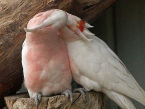 Da das Interesse der Gelbhaube aber nach einger Zeit doch wieder mehr unseren Schuhen galt, hatte der Galah endlich Gelegenheit, unser Interesse zu wecken. Als Michael sich hinhockte und den an den Schnürsenkeln zupfenden Gelbhaubenkakadu streichelte kam der Galah quer durch ein Blumenbeet angelaufen, schaute ihn herausfordernd an und winkte ihm mit einer Kralle.