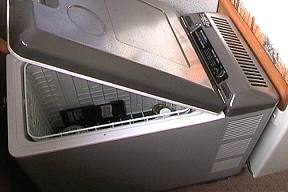 Der Kühlschrank arbeitet recht leise, eine Einstellung auf etwa 1/3 der Kühlleistung reicht aus. Trotzdem haben wir ihn über Nacht immer ausgeschaltet. Auch frisches Fleisch hält sich einige Tage frisch. Der Deckel öffnet sich Energiesparend nach oben. Dabei muss man aufpassen: Der Deckel ist durch seitliches Verschieben im Scharnier abnehmbar. Sollte er versehentlich beim Öffnen etwas verrutscht sein, so schließt er danch nicht mehr dicht ab. Also sollte man den Deckel vor dem Schließen immer schön nach links bis zum Anschlag schieben. Auf einer sehr üblen Gravel-Road zum Chambers Pillar waren die Bodenwellen so heftig, das sich der schwere Kühlschrank unten aus der Verankerung gelöst hat.