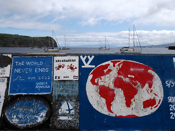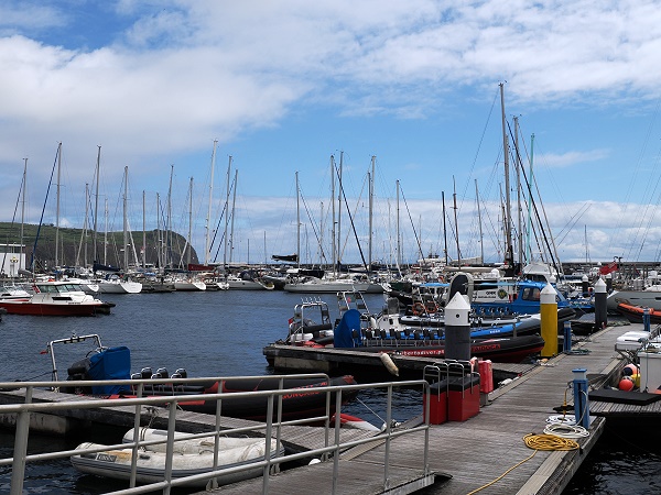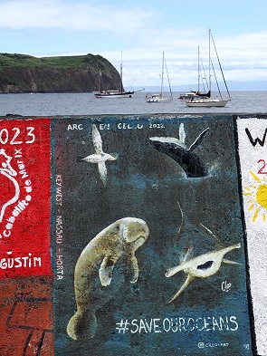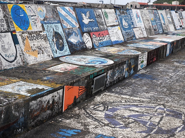 Die Marina da Horta, die von dieser bemalten Kaimauer umgeben ist, bietet Platz für etwa 300 Boote. Sie liegen hier gut geschützt durch Wellenbrecher. Es gibt moderne Versorgungseinrichtungen mit Strom, Wasser, Internet sowie passende Werkstätten. Auch Zoll- und Einreiseformalitäten für internationale Boote können direkt im Hafen erledigt werden.