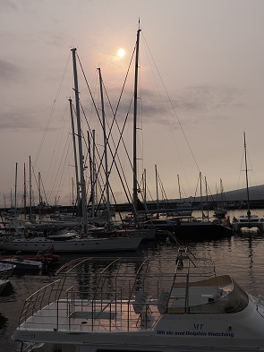 Als wir vor Ort waren, lagen auch viele Schiffe mit Anker in der Bucht vor der Marina, da dort kein Platz mehr frei war. Besonders beeindruckend waren die großen Luxusjachten, an denen wir bei der Einfahrt mit der Fähre vorbeikamen und die dort am Wellenbrecher eine eigene Kaimauer haben. Über den Schiffstracker auf dem Smartphone wurden uns auch gleich die Namen geliefert.
