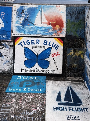 Es lohnt sich auf jeden Fall, dort vorbeizuschlendern. Bei unserem Besuch waren gleich fünf verschiedene Segler damit beschäftigt, neue Bilder zu malen. Es ist gar nicht so einfach, hier noch ein freies Plätzchen zu finden, einige weichen schon auf den Fußboden aus.