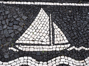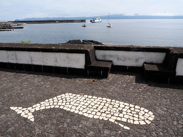 Wir folgten der kleinen Promenade entlang des Meeres in Richtung Hafen, mit weißen Steinen hat man im Gehweg schöne Muster in den dunklen Basalt gelegt: Wale oder Segelboote. Letztere konnten wir nahe der Hafenmeisterei auf dem Wasser beobachen, eine Schulklasse übte dort gerade das Segeln in kleinen Booten.