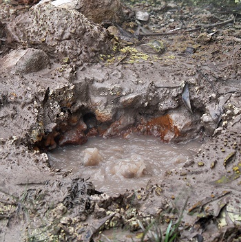 Die weiter unten liegenden Becken sind heißer, bei einem liegt die speisende heiße Quelle mit quasi kochendem Wasser nur ein paar Meter daneben. Das Wasser blubbert in der Quelle und plätschert über ein kleines Rinnsal neben dem höhergestellen Steg in das Badebecken hinein.