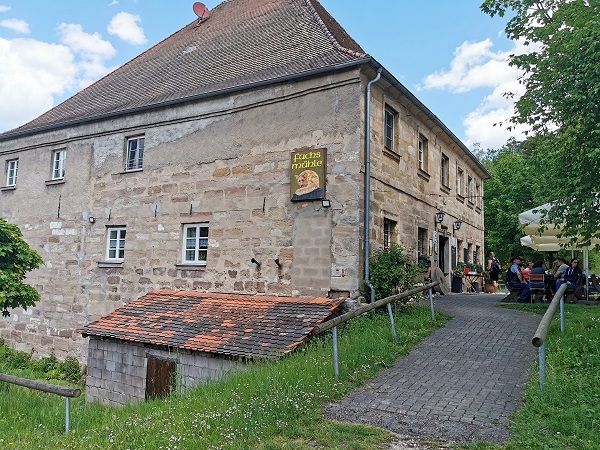 Auf dem Weg von Schwäbisch Hall nach Regensburg waren wir an einem warmen Sonnentag unterwegs und es war Muttertag. In einem abgelegenen Restaurant in Mittelfranken namens Fuchsmühle hatten wir schon vor Monaten für 12:00 Uhr einen Tisch reserviert. Das war gut so, denn hier war an diesem Mittag jeder Tisch gleich mehrfach belegt. Immer wieder mussten Wanderer ohne Reservierung wieder weggeschickt werden. Alle wollten bei dem schönen Wetter in den Biergarten - es waren aber alle 60 Plätze schon belegt. Satt und zufrieden von der üppigen Portion machten wir uns nach dem Essen auf den Weg, zuerst zum Kloster Plankstetten und danach fuhren wir ein Stück durch das Altmühltal.