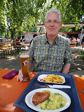 Als wir die Klosterkirche verließen hatten wir Hunger, aber es war uns zu voll im Biergarten, denn mittlerweile war es Mittag. So kauften wir Bier zum Verzehr in der Ferienwohnung und machten uns auf den Weg zurück zum Auto. Vom Parkplatz aus erreichten wir nach 10 Minuten Fahrt zum Nachbarort einen schönen Biergarten direkt am Ufer der Donau. Hier gab es einen kostenlosen Parkplatz, günstige Preise und einen Blick auf die Fähre Fähre Eining-Hienheim. Man holt sich Essen und Trinken bei den netten Leute an der Ausgabe und sucht sich den Platz im schönen Biergarten. Im Gegensatz zum touristischen Weltenburg war hier wenig los und wir genossen entspannt unsere Pause bei LKW (warmer Leberkäse mit Kartoffelsalat) für 5,90 Euro, Currywurst mit Pommes für 7,50 Euro und leckerem Kuchlbauer alkoholfreiem Weizenbier für 3,80 Euro. Weltenburger Klosterbier Barock Dunkel hätten wir hier auch bekommen.
