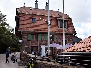Hier mussten wir dann in die alte Bahn umsteigen, in einem kleinen Café innerhalb der Bergbahnstation kann man sich stärken. Oder man geht zur Sonnenterasse vom Schlosshotel Molkenkur. Hier speist man mit beeindruckenden Panorama genau dort, wo sich in früheren Zeiten Kurgäste dem Fasten mit Ziegenmolke widmeten.