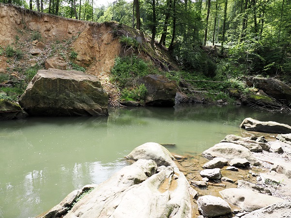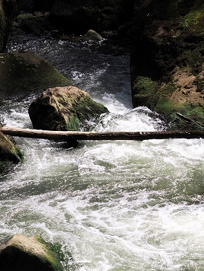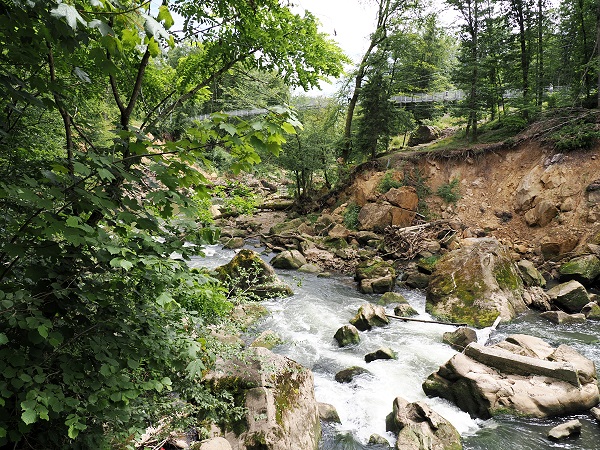 Ein echtes Biotop, das auch bedroht sein kann. Durch eine Flutkatastrophe im Sommer 2021 wurde der Bereich um die Irreler Wasserfälle stark beschädigt. Direkt an den Wasserfällen stand die berühmte "Teufelsbrücke", in den 1920ern nur ein Steg, ab 1959 ein überdachte Fußgängerbrücke aus Holz, die einen tollen Blick auf die Stromschnellen bietet. In der Mitte hatte sie eine Stützpfeiler, der auf einem Felsen direkt im Fluss stand. Auf einigen Webseiten wie z.B. hier beim SWR kann man noch Bilder davon sehen. Das Hochwasser in der Talenge mehr als deutliche Spuren hinterlassen: Die Wassermassen haben nicht nur die alte Wanderbrücke zerstört, sondern auch ganze Felsblöcke verschoben, enorme Hangrutschungen verursacht, das Flussbett stark verändert und ein Meer von Steinen und Sand, entwurzelten Bäumen und Treibgut hinterlassen. Von der alten Brücke ist nur noch das Bückenlager auf einer Seite als Aussichtspunkt übrig geblieben. Das bei unserem Besuch nur etwa kniehohe Wasser strömte damals sieben Meter hoch durch der Engstelle.