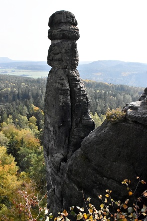 Ist man vom Nadelöhr oben angekommen, sollte man an der nächsten Kreuzung nach links einbiegen, wo die atemberaubende Aussicht auf den Gohrisch und den Papststein wartet. Auch lohnt sich ein kurzer Abstecher zum Aussichtspunkt am Opferkessel, einer kesselförmigen Vertiefung, die vermutlich in der letzten Eiszeit entstanden ist.