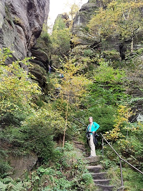 Schon seit dem 19. Jahrhundert wird der Pfaffenstein für touristische Zwecke genutzt und das merkt man auch. Selbst an einem Wochentag war hier viel los, aber es waren ja auch Herbstferien und so waren viele Familien mit Kindern vor Ort. Der zerklüftete und von zahlreichen Höhlen durchzogene Berg diente zu Zeiten des Krieges oft als Zufluchtsort für Einheimischen.
