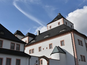 Die riesige Schlossanlage mit dem quadradischen Zentralbau liegt schon von Weitem sichtbar auf einem 516 Meter hohen Kegel aus Quarzporphyr über dem Zschopautal und ist umsäumt von alten Buchen. Die Wahl des Ortes, an dem der sächsische Kurfürst August sein Schloss zwischen 1568 und 1572 errichten ließ, ist ganz besonders. Durch die Höhe hat man einen wunderschönen Blick über das hügelige Land rundum.
