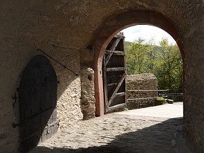 Man betritt die Burg durch das äußere, das Zugbrückentor von 1490. Das zweite Tor der Burg heißt Fuchstor, hier werden die Besucher vom Burgführer begrüßt und mit dem großen Burgschlüssel eingelassen. Dahintger beginnt der Rundgang. Vom dritten Torgebäude aus, dem Burgvogtsturm, wurden früher die Angreifer von oben mit Pfeilen, Steinen oder Pech vertrieben.