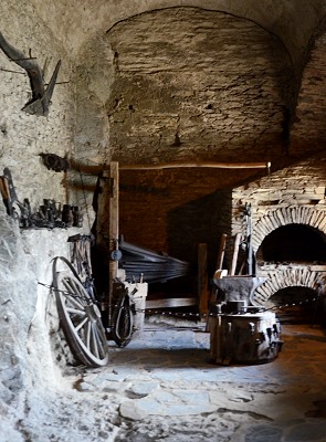 Über die Kellertreppe kommt man hoch in die Burgküche. Rund um den großen Kamin hat man die Gerätschaften und Gefäße ausgestellt, mit denen das Essen für die Bewohner der Burg bereitet wurde.