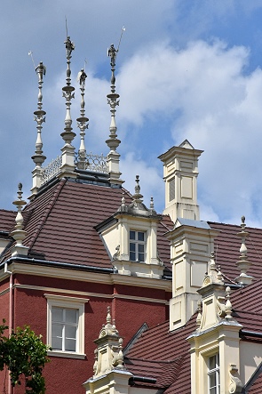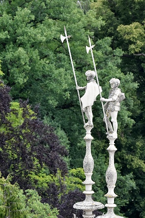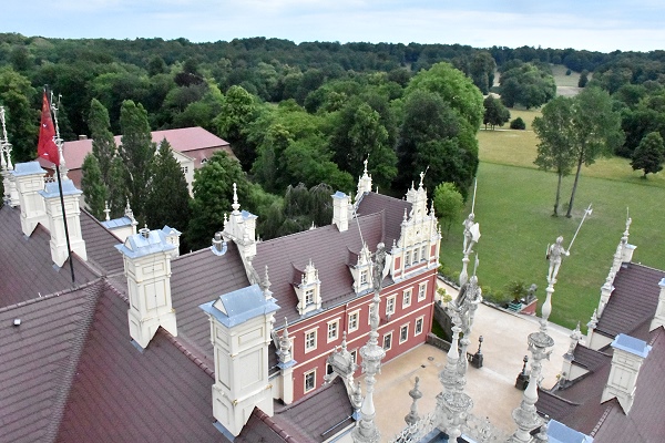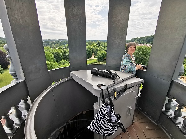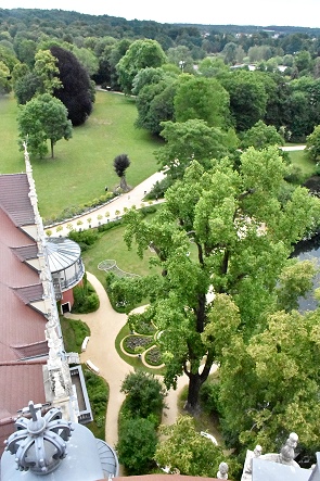 Auf dem Schlossturm kann man auch hoch steigen, oben angekommen ist nicht viel Platz, aber wir waren hier ganz alleine. In über 35 Meter Höhe hat man einen schönen Rundumblick auf die Region. Man sieht den Ort Bad Muskau, den umliegenden Schlosspark und die zahlreichen Figuren und Zinnen auf dem Schlossdach mal aus einer anderen Perspektive.