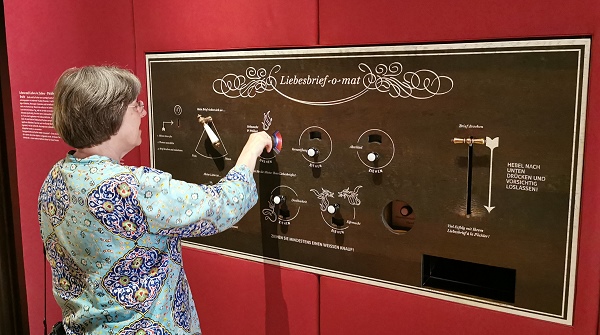 In Erinnerung an diese Liebesbriefe kann man sich heute in der Ausstellung an einer Maschine namens Liebesbrief-O-Mat einen eigenen im Stil der damaligen Zeit ausdrucken lassen. Man muss durch Knopfdruck und mit Hilfe von Hebeln einige Parameter einstellen und schon kommt am Ende ein gedruckter Brife heraus. Der war in unseren Fall allerdings ein wenig merkwürdig, denn wir hatten zwar das richtige Geschlecht des Empfängers eingestellt, es kam aber etwas anderes heraus. Trotzdem durchaus ein netter Spass, für den man auch nicht lange in der Schlange stehen musste.