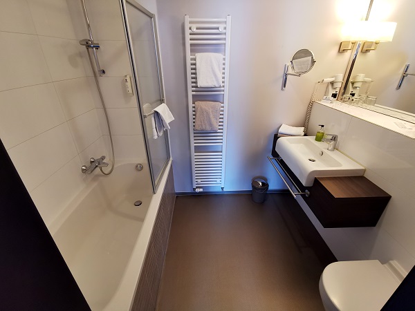 Hier hatten wir 24 m² zur Verfügung und das Fenster lag nach hinten zum Innenhof. So war es sehr ruhig und im bequemen Bett haben wir wunderbar geschlafen. Dazu kommen die üblichen Annehmlichkeiten in dieser Kategorie wie ein Flachbild-TV, schnelles WLAN, Verdunklungsvorhänge und Steckdosen in Bettnähe.