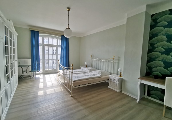 Im Schlafzimmer ein großes Bett, Steckdosen in Bettnähe, einen Schreibtisch und viel Schrankraum. Ausserdem Stühle und Tisch von Fermob für den kleineren Balkon. Wenn man sich hier ein wenig über die Brüstung beugte, konnte man die Straße hinunter auf dem Schornstein vom ehemaliger Schlachthof Zittau Störche in ihrem Nest sehen.