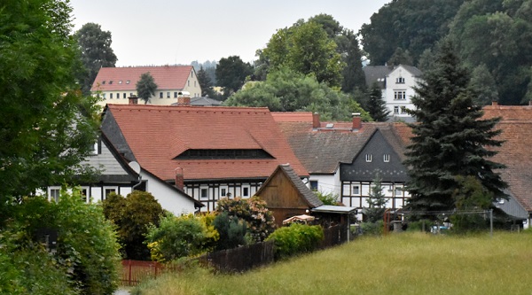 Entlang der Mandau stehen diese für die Region typischen Fachwerke, die so das größte intakte Ensemble dieser Art in der Oberlausitz bilden. Größtenteils waren das hier Weberhäuser, es gibt aber oben an der Hauptstrasse auch eine für ein Dorf ungewöhnliche Anzahl an Fabrikanten-Villen.