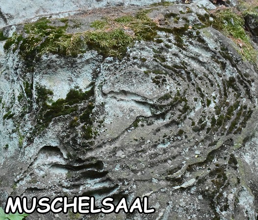 Die Felsformationen hier erinnern in ihrer Form an Abdrücke von Muschelschalen, daher bekam der Standort auch den Namen "Muschelsaal", obwohl sie nicht besonders hoch sind und einen Saaal sucht man vergeblich. Die Brauneisen-Einlagerungen im Kreisesandstein, welche man auf der Felswand in Form von Bändern, Wülsten, Ringen und Platten erkennen kann, sind als Naturdenkmal geschützt.