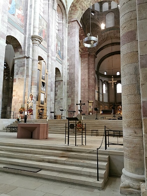 In der Nacht vom 5. auf den 6. Mai 1450 brannte der Dom völlig aus. Auf Grund der Zerstörungen des pfälzischen Erbfolgekrieges um 1689 und der Verwüstungen durch Revolutionstruppen im Jahr 1794 während der französischen Revolution erscheint der Dom heute im Innern relativ leer und schmucklos. Aber genau das hat uns gut gefallen. Denn die Gliederung des Baus und die romanische Formensprache kommen so viel eindrücklicher zur Geltung.