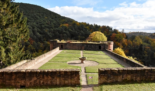 Doch leider war es sehr voll, der Parkplatz überfüllt und wir beschlossen auf Grund von Corona die Menschenmassen zu meiden. Das war eine gute Entscheidung, denn auf der Rückreise vom Schwarzwald nach Köln kamen wir im Oktober im gleichen Jahr noch einmal hier vorbei. Dieses Mal war der Parkplatz leer und durch den Herbstwald liefen wir 10 Minuten den ansteigenden Fußweg zur Ruine und zum Eingang.