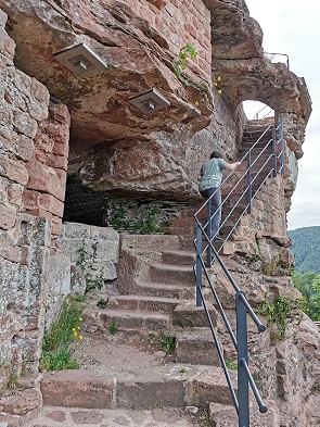 Zwischen Unter- und Oberburg besteht die Verbindung wie bei einigen anderen alten Burgen nur aus einer steilen Treppe am Basisfelsen der Oberburg entlang und zum Teil auch wie ein enger Tunnel durch diesen Felsen hindurch. Gut zu verteidigen, ganz schwierig anzugreifen. Wenn man den 15 Meter hohen, schmalen Felsen der Oberburg erklommen hat, kann man einen weiten Rundblick über den Pfälzerwald genießen. 100 m lange Geländer wurden zur Sicherung hier verbaut. Von der Oberburg aus hat man einen weiten Blick bis in die Rheinebene, aber auch auf den Trifels, die Ramburg und auf große Teile des Pfälzerwaldes.