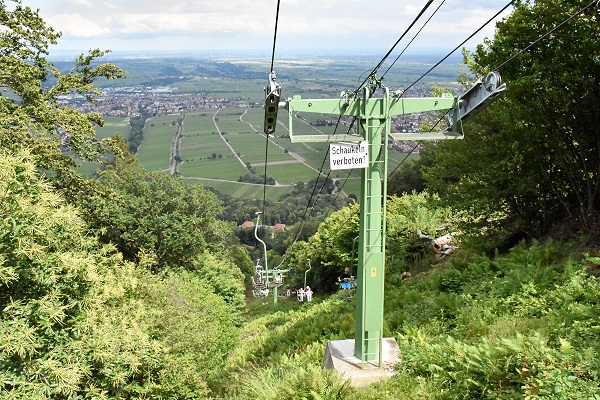 Hoch über dem hübschen Ort Edenkoben liegt die Burgruine Rietburg. Und dort kommt man entweder zu Fuß hinauf, oder man lässt sich fahren. Schon lange wollte ich unbedingt noch einmal mit einem Sessellift fahren und hier hatte ich endlich mal wieder die Gelegenheit. Ein Blick zum Himmel zeigte zwar einige dunkle Wolken, aber wir fuhren trotzdem zur Talstation und fanden dort auch auf Anhieb einen Parkplatz. Oben hatten wir dann Glück und es wurde wieder etwas heller.