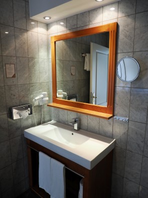 Unser großzügiges Doppelzimmer Nummer 306 war ausgestattet mit Bad, LCD-TV, dimmbaren Lichtern, Radio, Minibar, Safe und kostenlosem WLAN sowie Ausblicken auf die Weinreben innerhalb der Schlossmauern. Die helle Einrichtung war auf ca. 20 m² eine Mischung aus Moderne und romantischem Biedermeierstil des 19. Jahrhunderts, mit Marmorbad und hochwertigen Pflegeprodukten. Im bequemen, extralangen Bett haben wir sehr gut geschlafen.