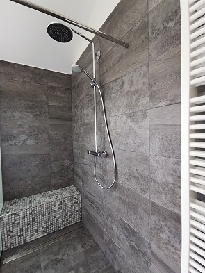 Sehr gut gefallen hat uns auch das moderne Badezimmer, ein Traum in den Farben Anthrazit und Weiß! Dazu gibt es Handtücher in Anthrazit und Türkis. Über einen hellen Flur mit Leseecke und Oberlicht erreicht man das Bad, gelüftet wird hier mit Fenster. Die einzige Stufe von Küche zum Flur wird nachts automatisch beleuchtet.