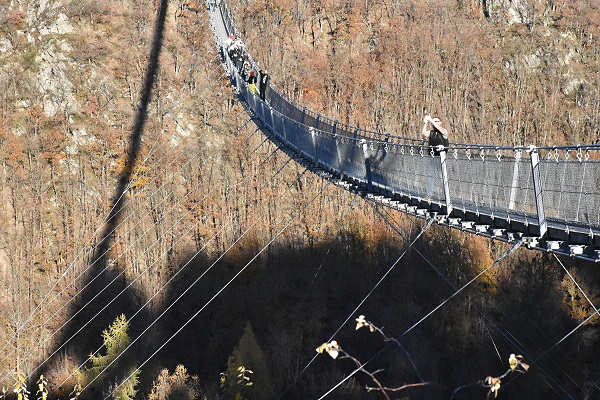 Ende Mai 2015 wurde hier mit dem Bau begonnen und die Eröffnung fand am 03. Oktober 2015 statt. Die Brücke wurde wurde von Schweizer Firmen aus Chur geplant und gebaut, sie hat eine Gesamtlänge von 360 m und eine maximale Höhe über dem Boden von knapp 100 m. Das Eigengewicht liegt bei 62 Tonnen.