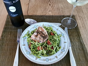 Am letzten Tag hatten wir mittags hervorragend schon in St. Peter gegessen und machten uns am Abend nach der Rückkehr dann nur schnell noch einmal Nudeln mit Bärlauch-Pesto, Tomaten und Lachs. Dazu ein kühler Cabernet Blanc und wir waren glücklich, denn für die nächsten Tage waren nach unserer Abreise in Buchholz schon wieder zwei Restaurants in der Pfalz reserviert.
