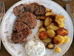 Denn auch am fünften Abend genossen wir das Kochen in der tollen Küche, denn hier fühlten wir uns sehr wohl. Wir kauften bei Rewe ein und machten uns Filet mit Bratkartoffeln und Zaziki.