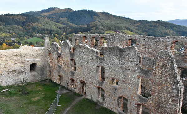 In der Kernburg lag ein erster Palas direkt am Bergfried, hier kann man noch die Reste einer Innenwand sehen. Es gab wohl noch einen zweiten, jüngeren Palas, bevor im 15. oder 16. Jh. der jetzige Palas im Süden erbaut wurde. Heute wohnen hier auf einer Seite der Anlage wohl eher seltene Pflanzen oder Eidechsen, ein Teil des Innenhofs war bei unserem Besuch aus Naturschutzgründen abgesperrt.