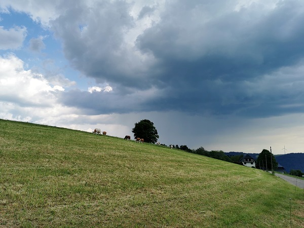 So kamen wir über die Platte am Plattenhof vorbei, wo Kühe und Pferde auf der Weide standen. Von da aus war es nicht mehr weit bis zum Auto, dabei kamen wir auch noch am Gschwinghof vorbei. Regen war bis dahin nicht gefallen, das Gewitter zog an der Region vorbei.