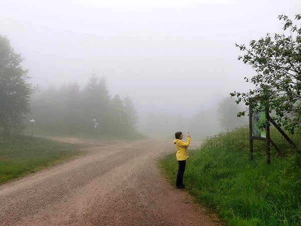 Auf dem Siedigkopf kamen wir am Lothardenkmal des Gengenbacher Künstlers Norbert Feger vorbei, das an den Orkan erinnern soll. Auch hier nur Wolken und Null Sicht, nur ein Reiter mit Pferd machte gerade Pause, eine Szene wie aus einem Western-Grusel-Schocker.