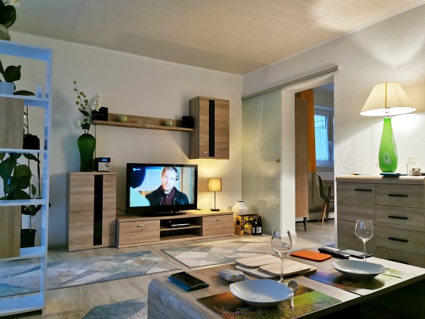 Die 60 m² große Ferienwohnung liegt in einem ruhigen Seitental am Rand eines ruhigen Wohngebietes einige hundert Meter abseits der Durchgangsstraße. Rund um die Siedlung ist Wald, am Abend hörten wir die Eulen rufen. Über einen privaten Eingang erreicht man von der Terrasse aus die Wohnung und steht zuerst im Wohnzimmer.