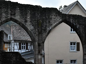 Der erste Blick auf die roten Sandsteinmauern gefiel uns gut. Man kann hier ohne Eintritt herumwandern. Die ältesten noch erhaltenen Bauteile der Ruine, die aus lokalem Buntsandstein erbaut wurde, werden auf Anfang bis Mitte des 13. Jahrhunderts datiert. Am kreuzförmigen Kirchenbau sind noch Stilmerkmale aus allen Bauphasen des Kirchengebäudes von Spätromanik bis zur Spätgotik erkennbar. Der Westteil bestand aus einem dreischiffigen spätgotischen Langhaus mit spätromanischer Fassade im Eingangsbereich.