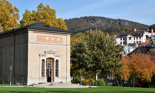 Das Kurhaus mit dem berühmten Casino ist architektonischer und gesellschaftlicher Mittelpunkt sowie Wahrzeichen der Stadt und hier begannen wir unseren Rundgang an der Trinkhalle. 16 korinthische Säulen stützen die 90 m lange offene Vorhalle, in welcher die Gäste lustwandelnd 14 Wandbilder betrachten können. Die Bilder sind von Jakob Götzenberger gestaltet worden und sie stellen Szenen aus der Sagen- und Mythenwelt der näheren Umgebung dar wie z.B. die Nixen im Mummelsee, teilweise auch Ereignisse aus der Stadtgeschichte oder religiöse Motive.