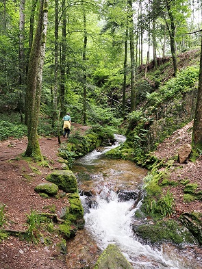 Die dann folgende Wasserfallschlucht ähnelt den gut drei Kilometer weiter südlich gelegenen größeren Allerheiligen-Wasserfällen, die zum benachbarten Talsystem der Rench gehören. Dafür ist man hier fast alleine unterwegs, wir sahen nur wenig andere Wanderer, während der Parkplatz von Allerheiligen voller Autos war, als wir etwas später dort vorbei fuhren.