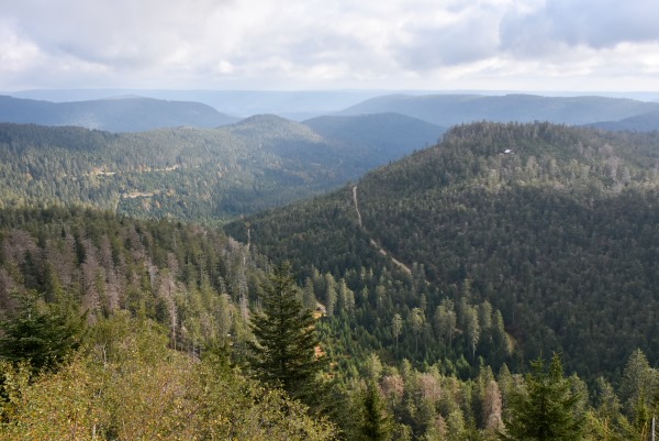 Von der Aussichtsplattform direkt daneben aus hat man hier vom höchsten Punkt des Nordschwarzwalds eine unvergessliche Sicht in die Rheintalebene nach Frankreich bis weit in die Vogesen. Nur bei sehr guter Sicht sind im Süden einige Gipfel der Alpen erkennbar. Nach Westen hin fällt das Gelände vom Gipfel der Hornisgrinde bis runter ins Rheintal auf nur 8 Kilometer Entfernung über 1.000 Höhenmeter ab. Unten liegt der Ort Sasbachwalden am steilen Hang.
