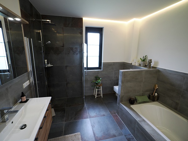 Im Erdgeschoss kommt als erstes der Flurbereich mit Treppe nach oben. Hier stehen Regenschirme und das Saunazubehör. Geradeaus geht es in das große Badezimmer mit Riesendusche, Doppelwaschbecken, Badewanne sowie Waschmaschine und Trockner. Hier ist alles barrierefrei, denn die Gastgeber werden später im Alter selbst hier wohnen. Dem ensprechend hochwertig ist die gesamte Ausstattung.