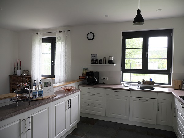 Nebenan befindet sich die schöne, offene Küche. Hier findet man alles, was man braucht. Ein Riesenkühlschrank mit integriertem Eiswürfelbereiter und eine Spülmaschine, Backofen und Mikrowelle. Auch eine Grundausstattung an Ölen, Essig, Kaffee, Tee und Gewürzen ist vorhanden. Sogar einen Kaffeevollautomaten für ganze Bohnen gibt es hier und zum Emfgang gab es Wasser, Bier, Lindt-Kugeln, leckeren Marmorkuchen und Brezeln.