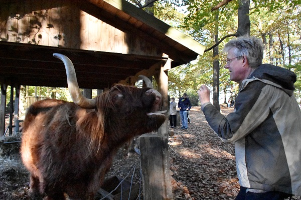 Bei unserem Besuch lagen überall auf dem Boden Bucheckern und Kastanien herum, die von den Kindern und Erwachsenen mit Begeisterung aufgesammelt und über den Zaun zu den Schweinen geworfen wurden, die sich sofort darauf stürzten. Eines der Hochlandrinder öffnete einfach sein Maul und ließ sich zur allgemeinen Begeisterung die Eicheln und Kastanien direkt hinein werfen.