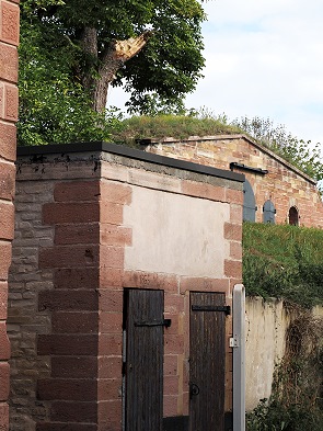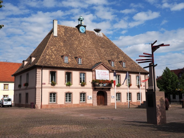 Dabei kamen wir auch am Vauban-Kanal vorbei, der im Jahr 1699 als Transportweg für den Festungsbau in kurzer Zeit erstell wurde. Über eine Länge von 28 km verband er die Steinbrüche von Pfaffenheim am Fuß der Vogesen mit der Baustelle der Festung. Das Baumaterial, Holz für Gerüste und Steine für den Bau der Festungsmauern wurde hier auf flachen Kähnen von je drei Soldaten gezogen. 1703 wurde der Kanalabschnitt zwischen Vogesen und Ill zugeschüttet, heute ziehen hier nur noch Enten ihre Kreise auf dem Wasser. Die Soldaten wurden auch für alle Arbeiten am Bau selbst mit eingesetzt, so ergab sich die erstaunlich kurze Bauzeit von nur 4 Jahren.